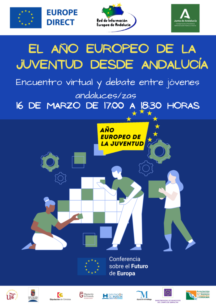 El próximo 16 de marzo y con motivo de la celebración del Año Europeo de la Juventud, el Centro Oficial de Información de la Comisión Europea, Europe Direct, llevará a cabo una actividad online de forma conjunta con los demás centros andaluces con el objetivo de propiciar un espacio de encuentro en el que los jóvenes debatan sobre temas como el Pacto Verde Europeo, la participación democrática y la movilidad en la Unión Europea.