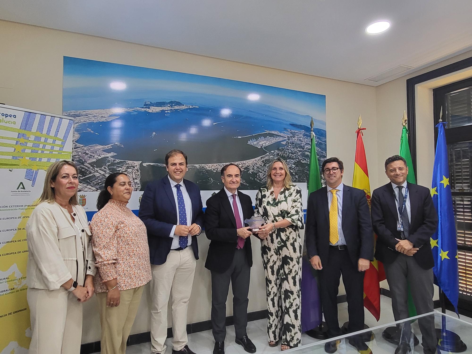 La presidenta de la Mancomunidad de Municipios del Campo de Gibraltar, Susana Pérez Custodio, junto a los vicepresidentes Vázquez Hueso y García León han hecho entrega al presidente de la APBA, Gerardo Landaluce, del galardón “Proyecto Europeo del mes” por la iniciativa “Última milla del ramal central ferroviario”.