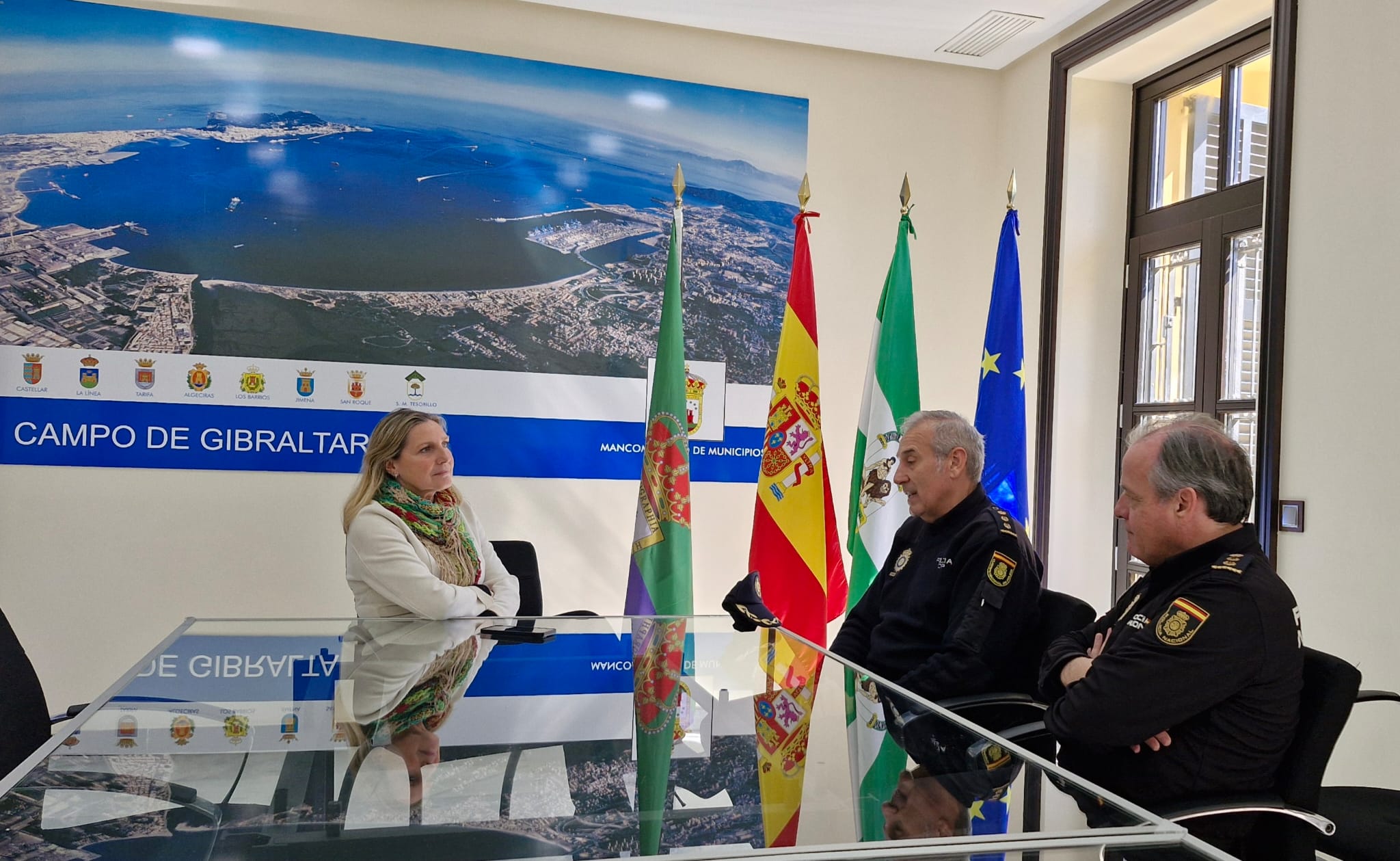 Pérez Custodio agradeció la visita de ambos comisarios y felicitó a Lucio-Villegas por su nombramiento, a la vez que reiteró el reconocimiento de la comarca a los efectivos de la Policía Nacional ante el excelente trabajo desarrollado , labor que fue reconocida por la Institución Comarcal con la entrega de la Medalla del Campo de Gibraltar a las Comisarias de Algeciras y La Línea de la Concepción.