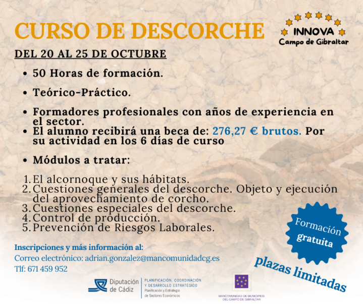La Mancomunidad de Municipios del Campo de Gibraltar, en el marco del programa “Innova Campo de Gibraltar 2025”, financiado por la Excma. Diputación Provincial de Cádiz, pone en marcha un nuevo Curso de Descorche de Alcornoques, que se desarrollará del 20 al 25 de octubre, con plazas limitadas.