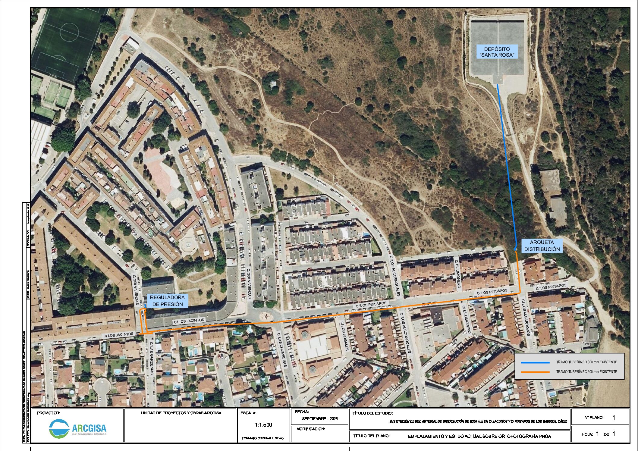 Ante esta situación, y con el objetivo de evitar nuevas averías en la red que pongan en peligro la garantía de suministro y una potencial afectación de los servicios que discurren por los acerados, ARCGISA ha iniciado los trabajos para la sustitución de esta infraestructura, que contemplan la instalación de una nueva tubería de fundición dúctil de 300 mm de diámetro, habiéndose realizado ya los levantamientos topográficos, el estudio de trazado de la tubería existente, entre otras labores previas..