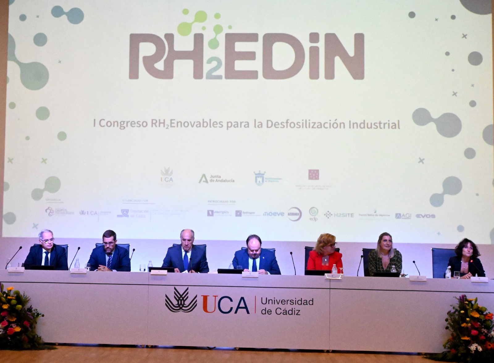 El acto inaugural del Congreso RH₂EDiN 2025 ha contado con la participación del rector de la Universidad de Cádiz, Casimiro Mantell; el alcalde de Algeciras, José Ignacio Landaluce; la subdelegada del Gobierno en Cádiz, Blanca Flores; el secretario general de Industria y Minas de la Junta de Andalucía, José Javier Alonso; el vicepresidente tercero de la Diputación de Cádiz, Jacinto Muñoz; y la directora de la ETSIA, Paloma Cubillas.