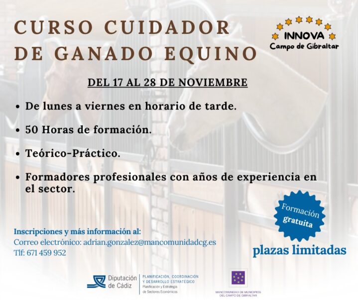 El curso, de carácter gratuito y con plazas limitadas, se desarrollará del 17 al 28 de noviembre, en horario de tarde, en La Línea de la Concepción. Con una duración de 50 horas teórico-prácticas, la formación será impartida por profesionales con amplia experiencia en el sector equino, proporcionando a los participantes los conocimientos técnicos y las habilidades prácticas necesarias para el cuidado, manejo y mantenimiento del ganado equino.