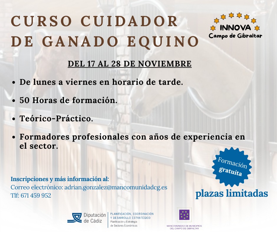 El curso, de carácter gratuito y con plazas limitadas, se desarrollará del 17 al 28 de noviembre, en horario de tarde, en La Línea de la Concepción. Con una duración de 50 horas teórico-prácticas, la formación será impartida por profesionales con amplia experiencia en el sector equino, proporcionando a los participantes los conocimientos técnicos y las habilidades prácticas necesarias para el cuidado, manejo y mantenimiento del ganado equino.